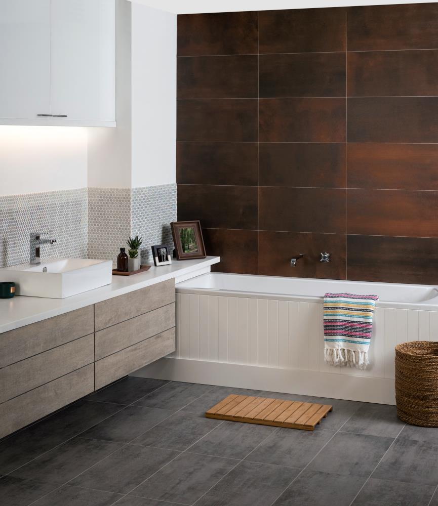 The Steel Concept range comes in copper and steel finishes, with steel itself presenting options in metallic grey, midnight blue, white and black. Rectified glazed porcelain is a material that offers a level of quality beyond ceramic tiles, not only for its long term sustainability and hard-wearing nature, but for the overall aesthetic quality and versatility it presents.